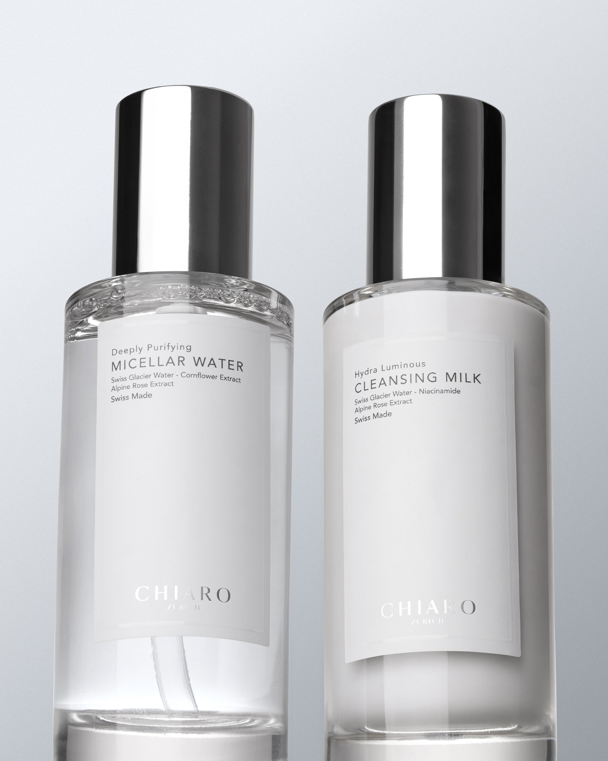 Unsere cremig‑milde Hydra Luminous Cleansing Milk entfernt Make‑up und SPF, während das klärende Deeply Purifying Micellar Water die Haut erfrischt und beruhigt. Mit Schweizer Gletscherwasser, Niacinamid und Alpenrosenextrakt für reine, hydratisierte Haut.