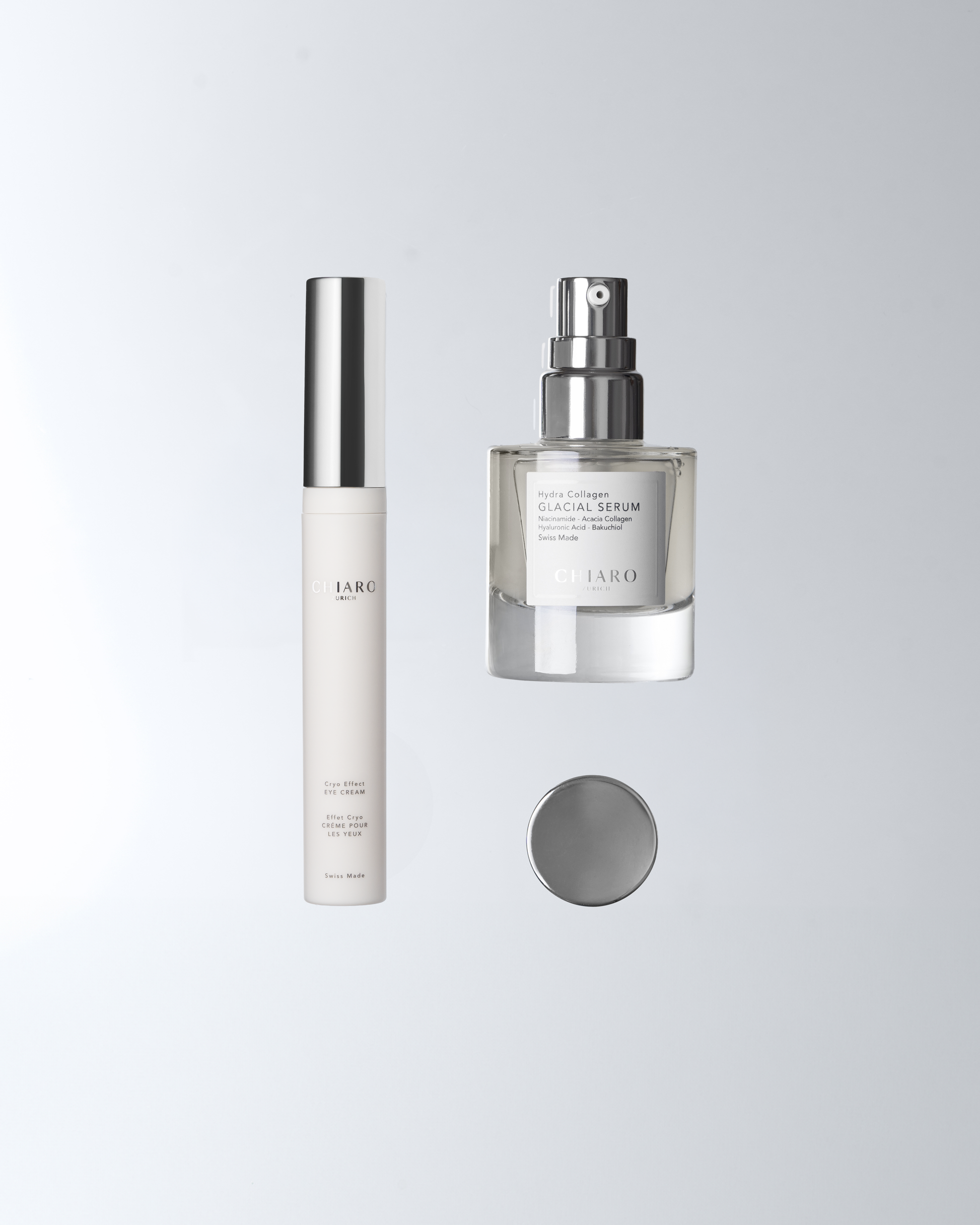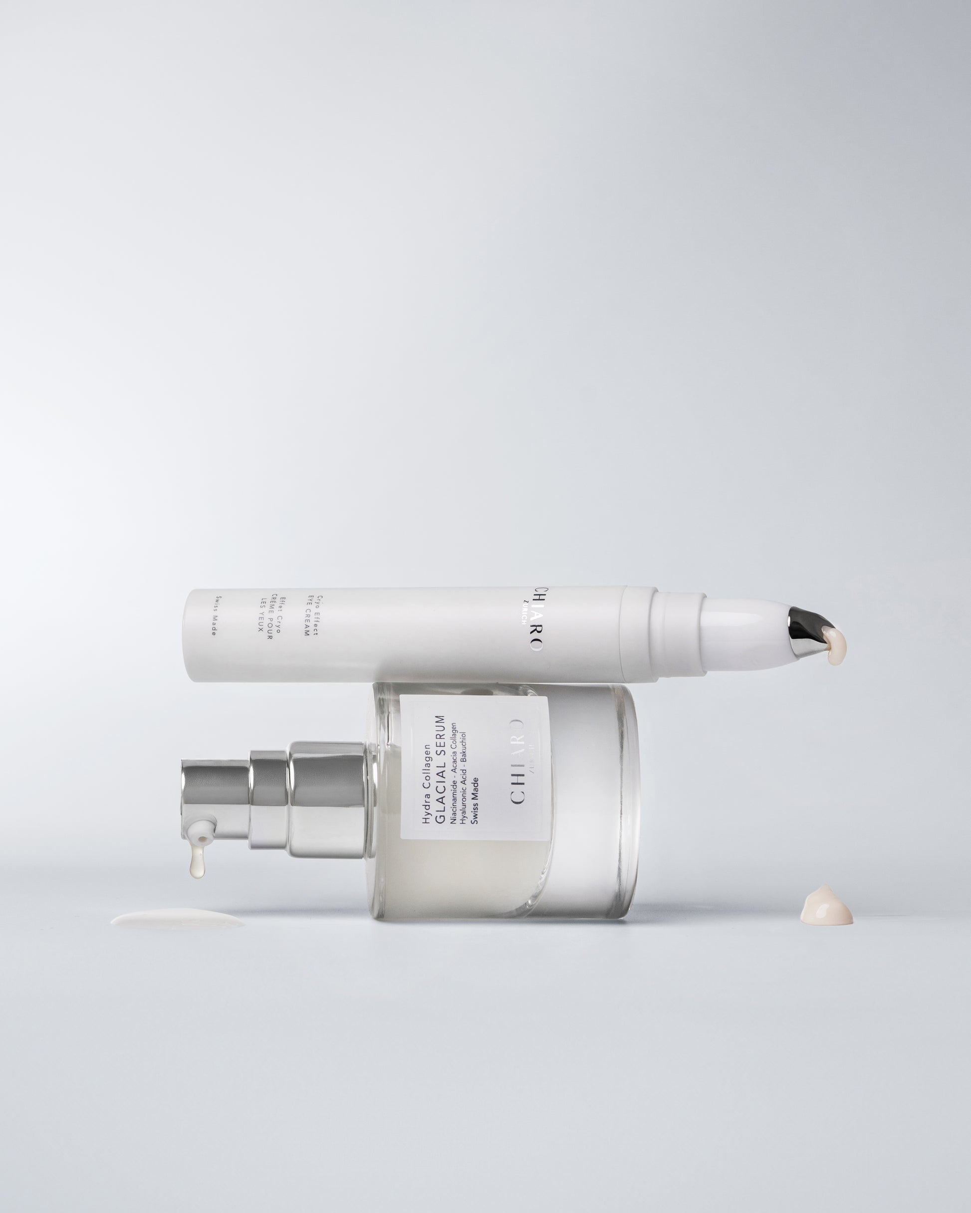 Wake-up Glow für Gesicht und Augen. Das Hydra Collagen Glacial Serum spendet sofortige Feuchtigkeit, verbessert Spannkraft klinisch erwiesen. Die Cryo Effect Eye Cream reduziert Augenringe, glättet Linien klinisch ewiesen in 28 Tagen und wirkt dank kühlendem Applikator abschwellend. Sie enthält unter anderem Hyaluronsäure, Edelweiss‑Extrakt, Eye’fective‑Komplex, Niacinamid und Schneealgenextrakt.